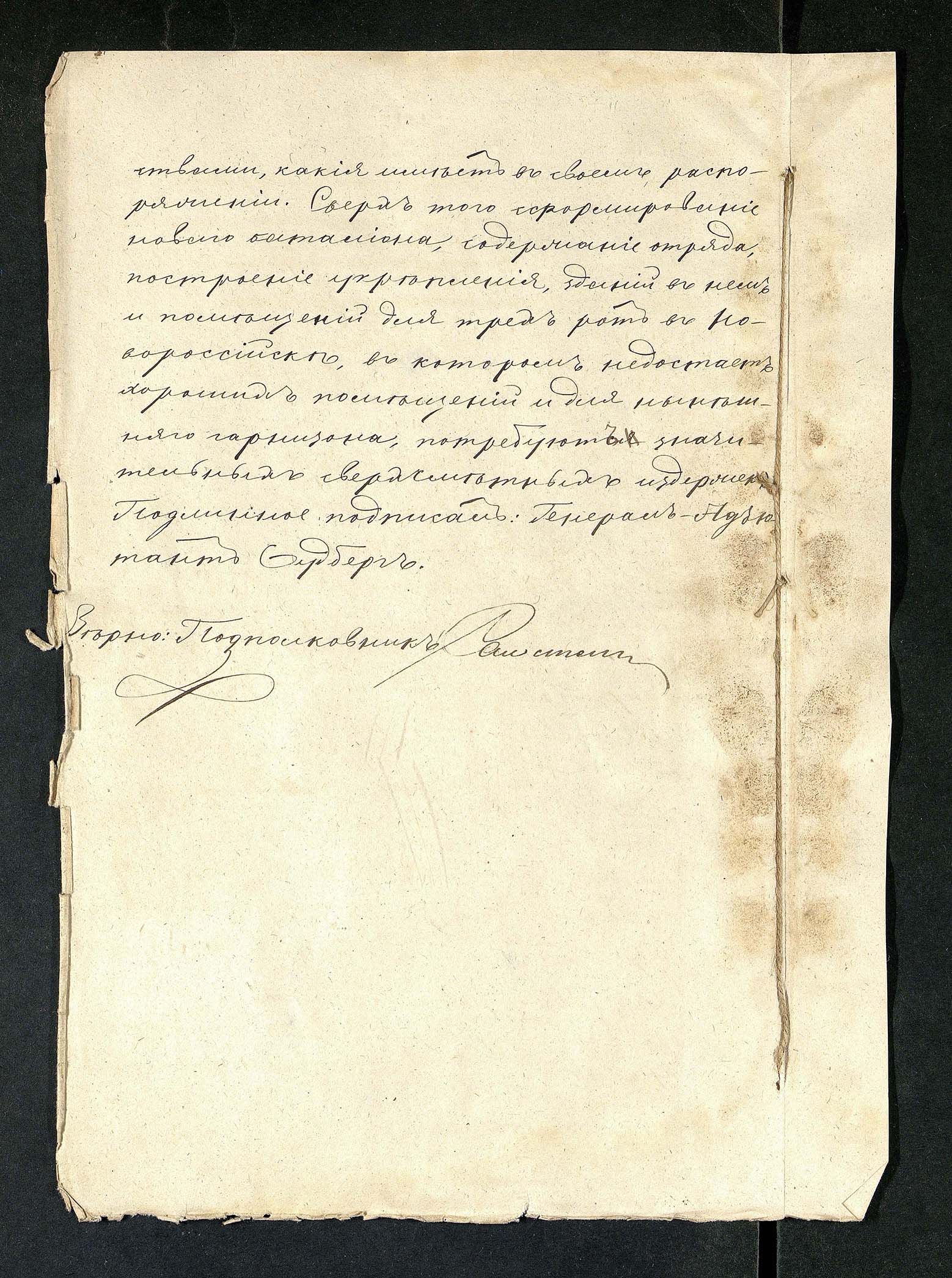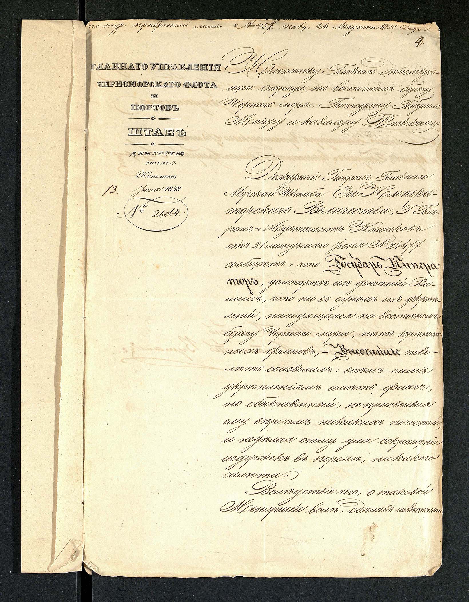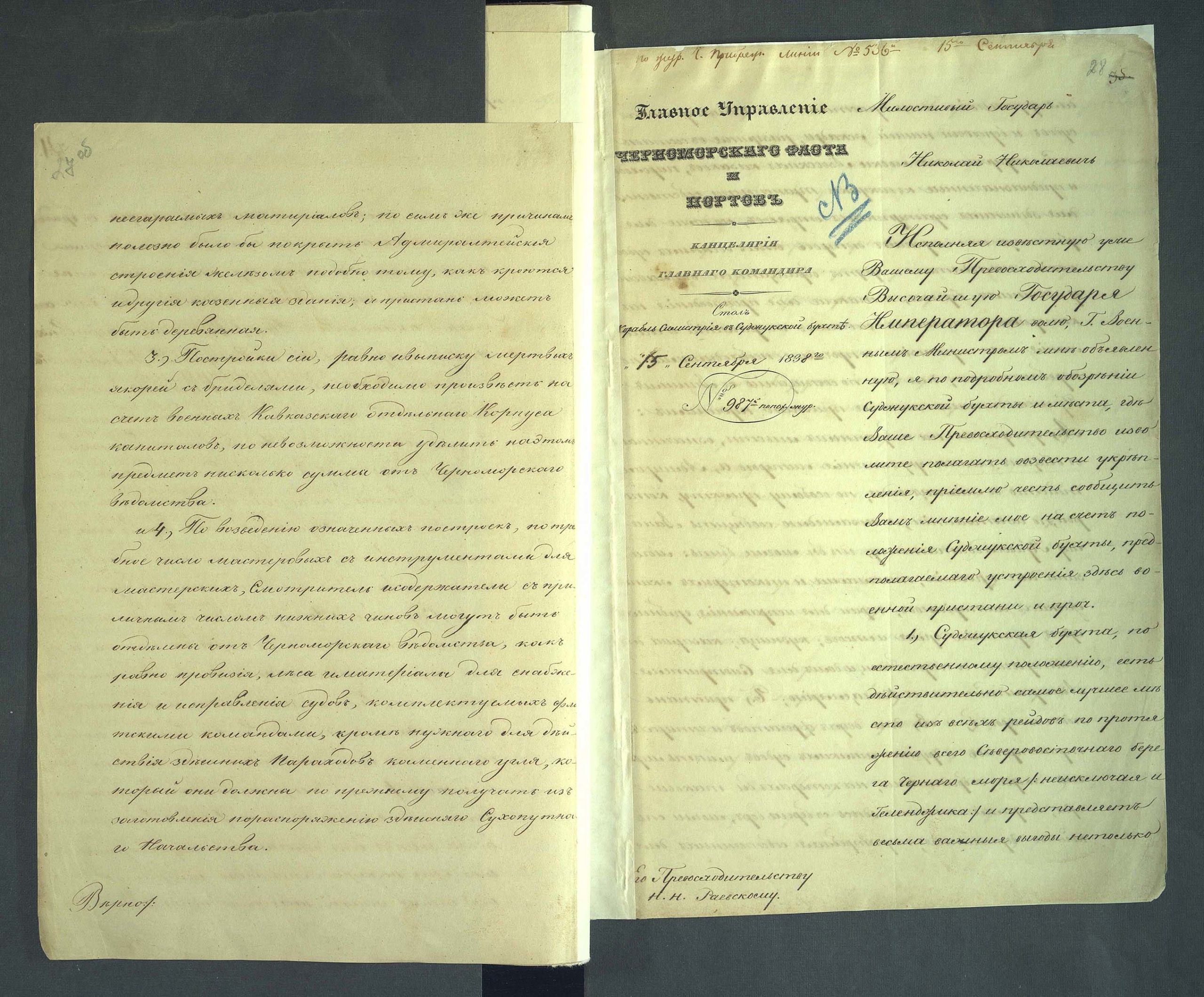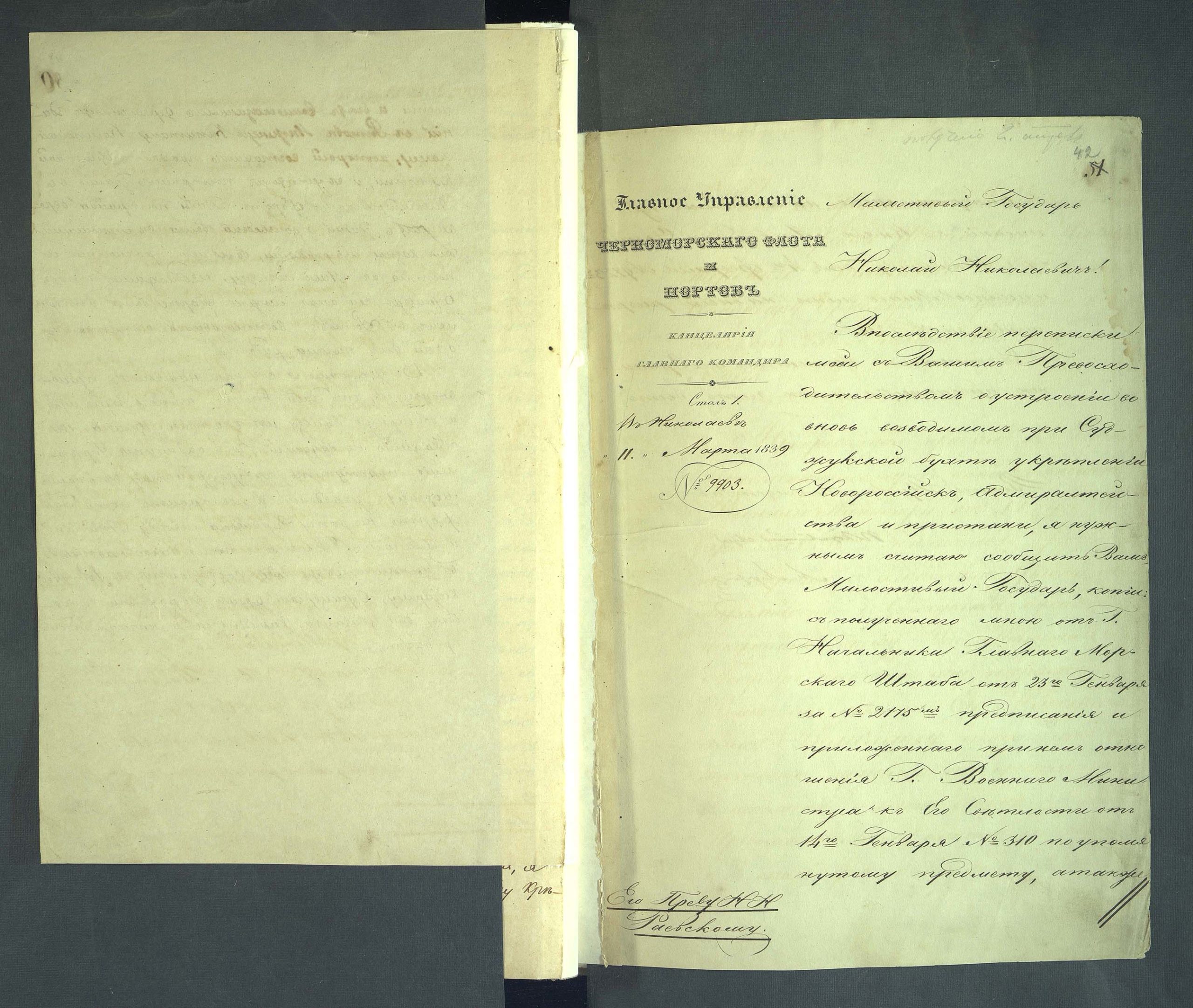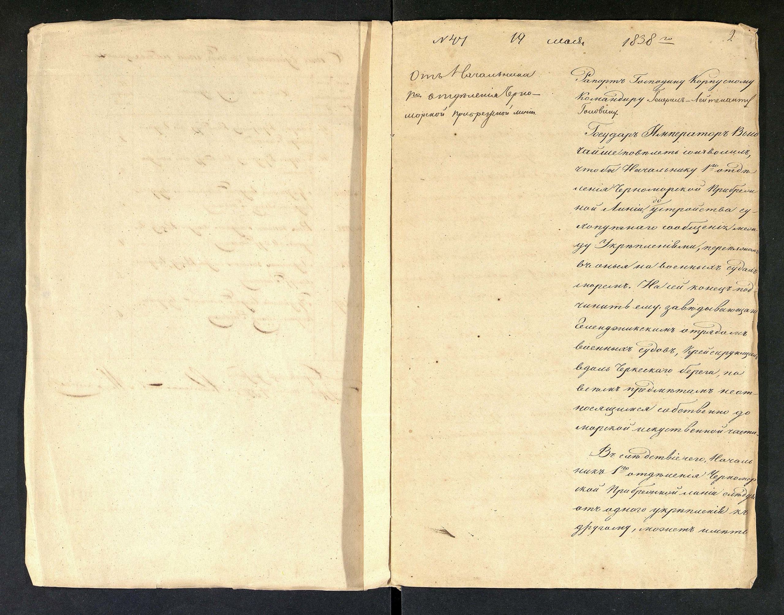 Документы ГКУ КК «Государственный архив Краснодарского края», фонда № 260 «Канцелярии начальника Черноморской береговой линии», опись № 1, оцифрованное дело № 17 «О занятии устья реки Цемеса в Суджукской бухте под устройство там Адмиралтейства и пристани», за 1838-1844 гг. — Письмо