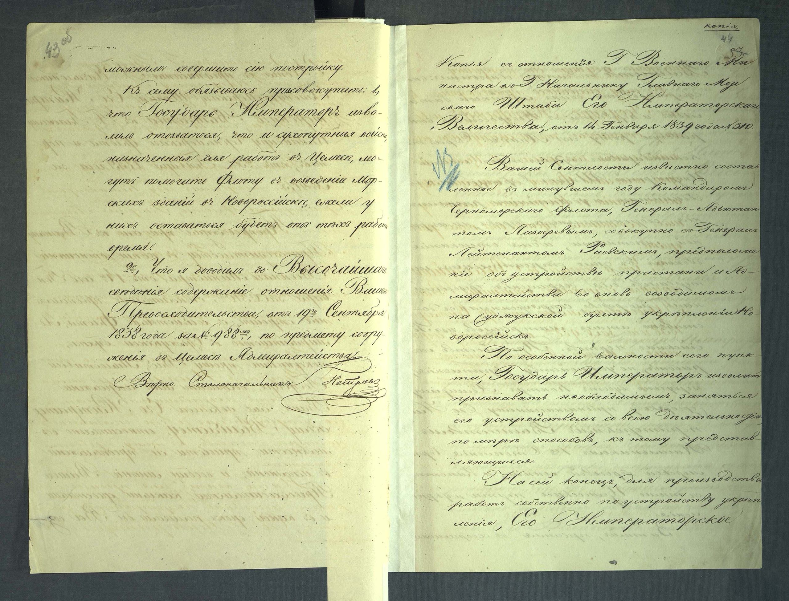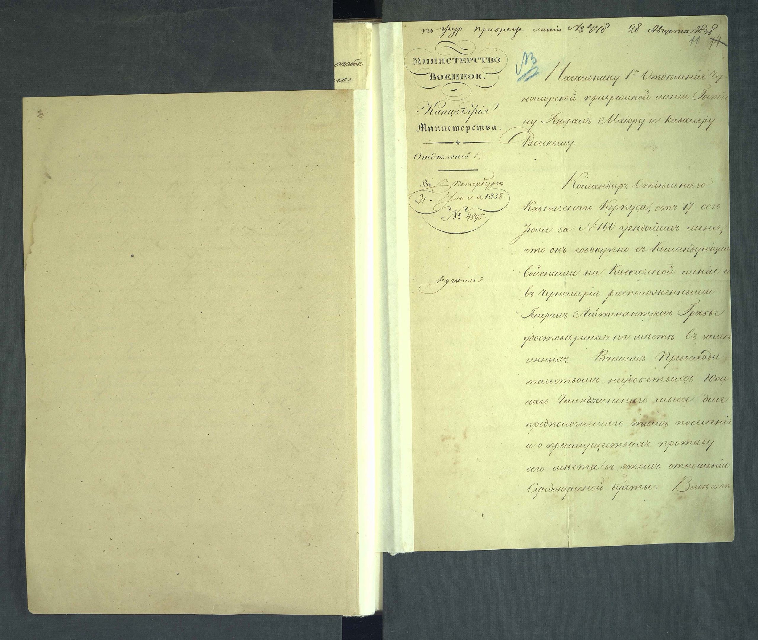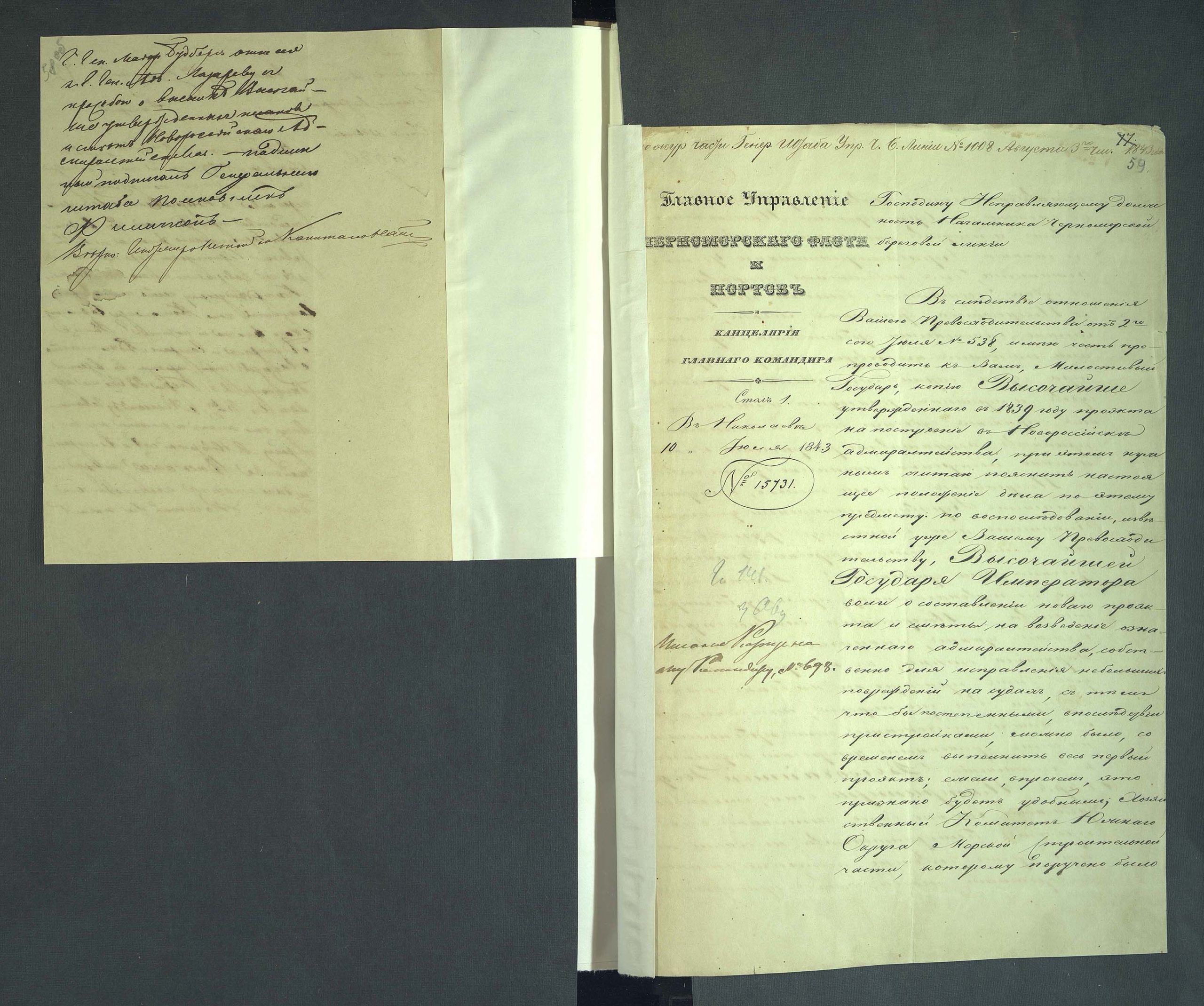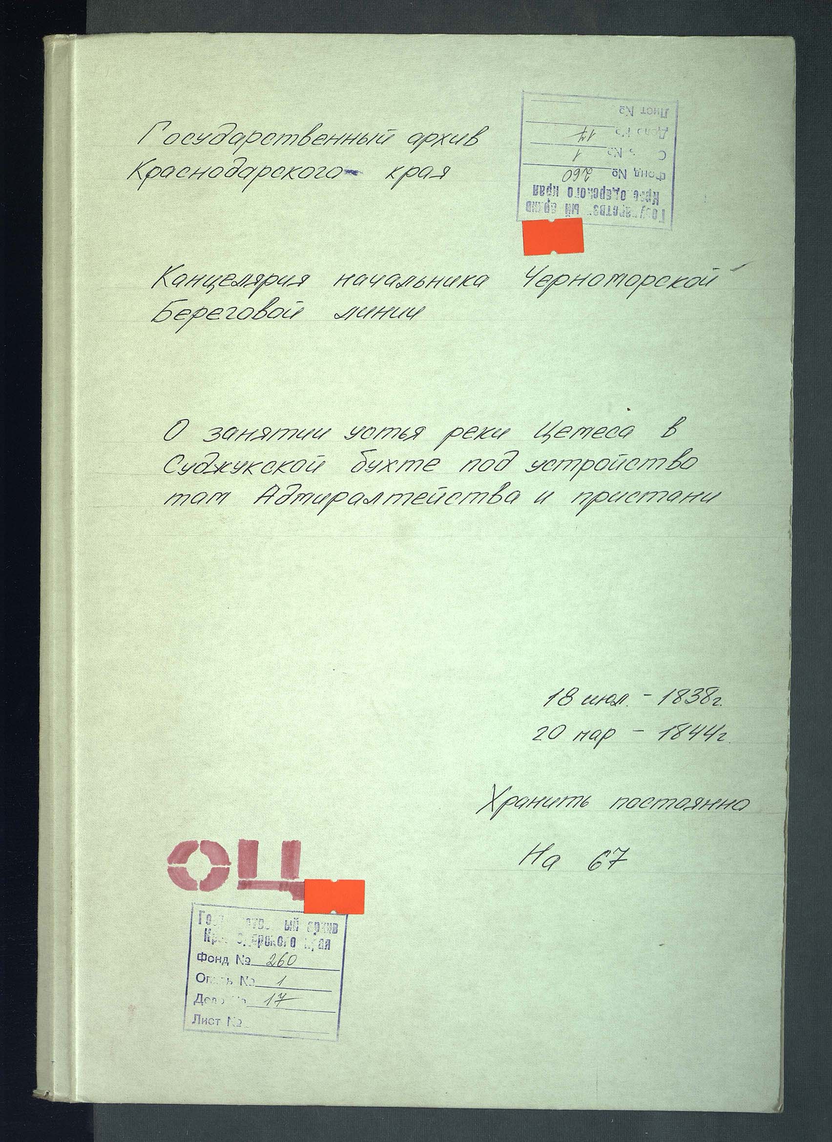 Документы ГКУ КК «Государственный архив Краснодарского края», фонда № 260 «Канцелярии начальника Черноморской береговой линии», опись № 1, оцифрованное дело № 17 «О занятии устья реки Цемеса в Суджукской бухте под устройство там Адмиралтейства и пристани», за 1838-1844 гг. — Письмо