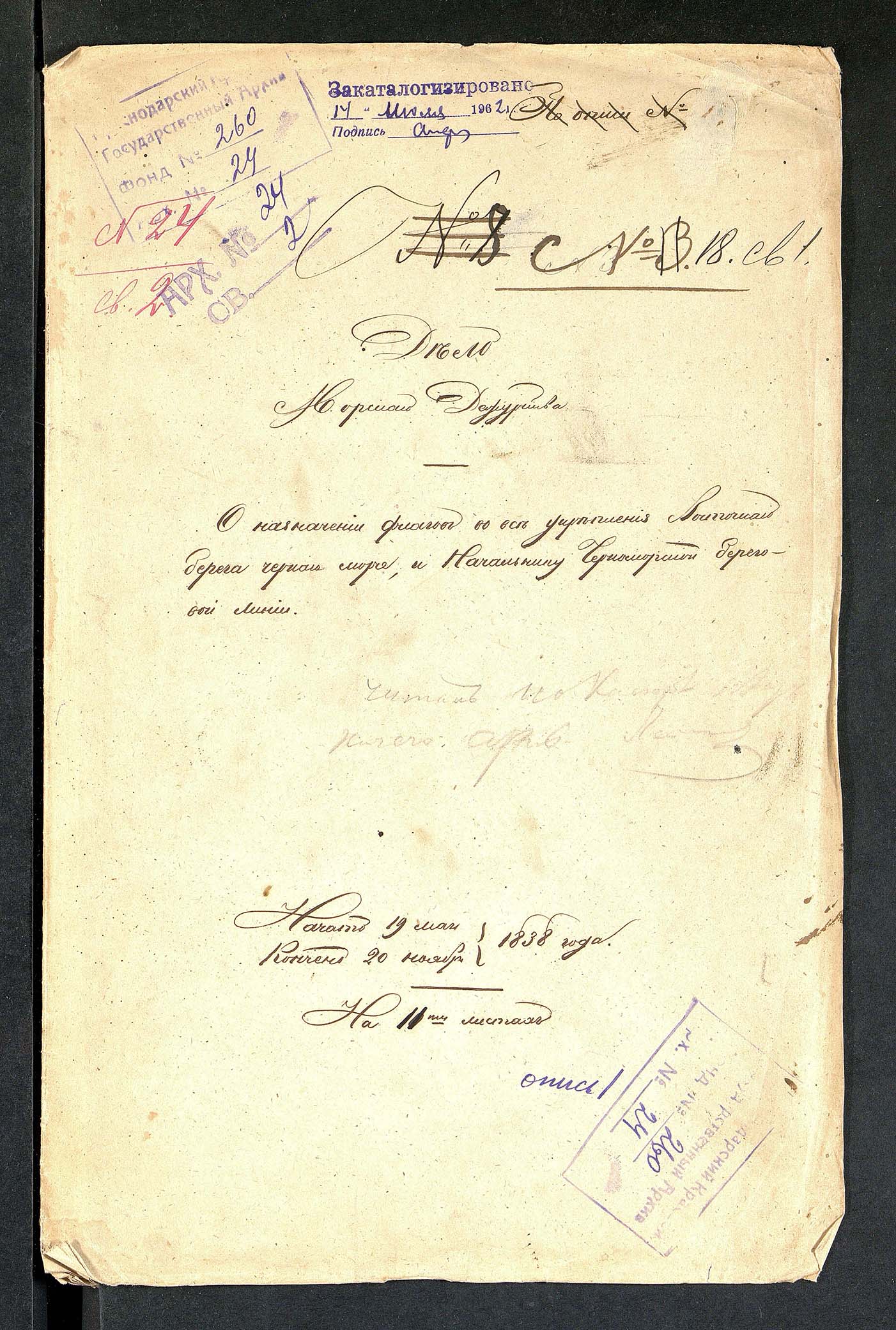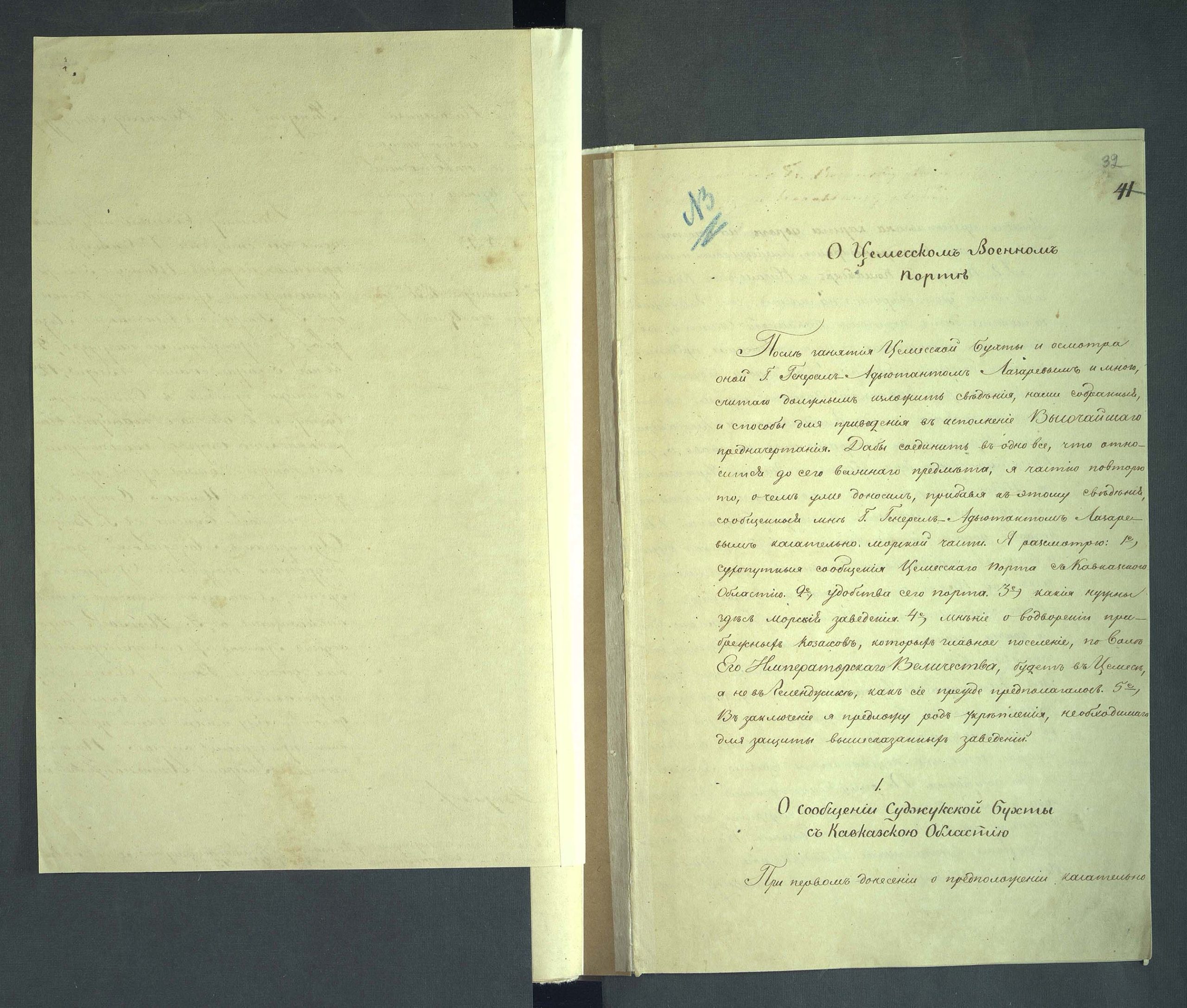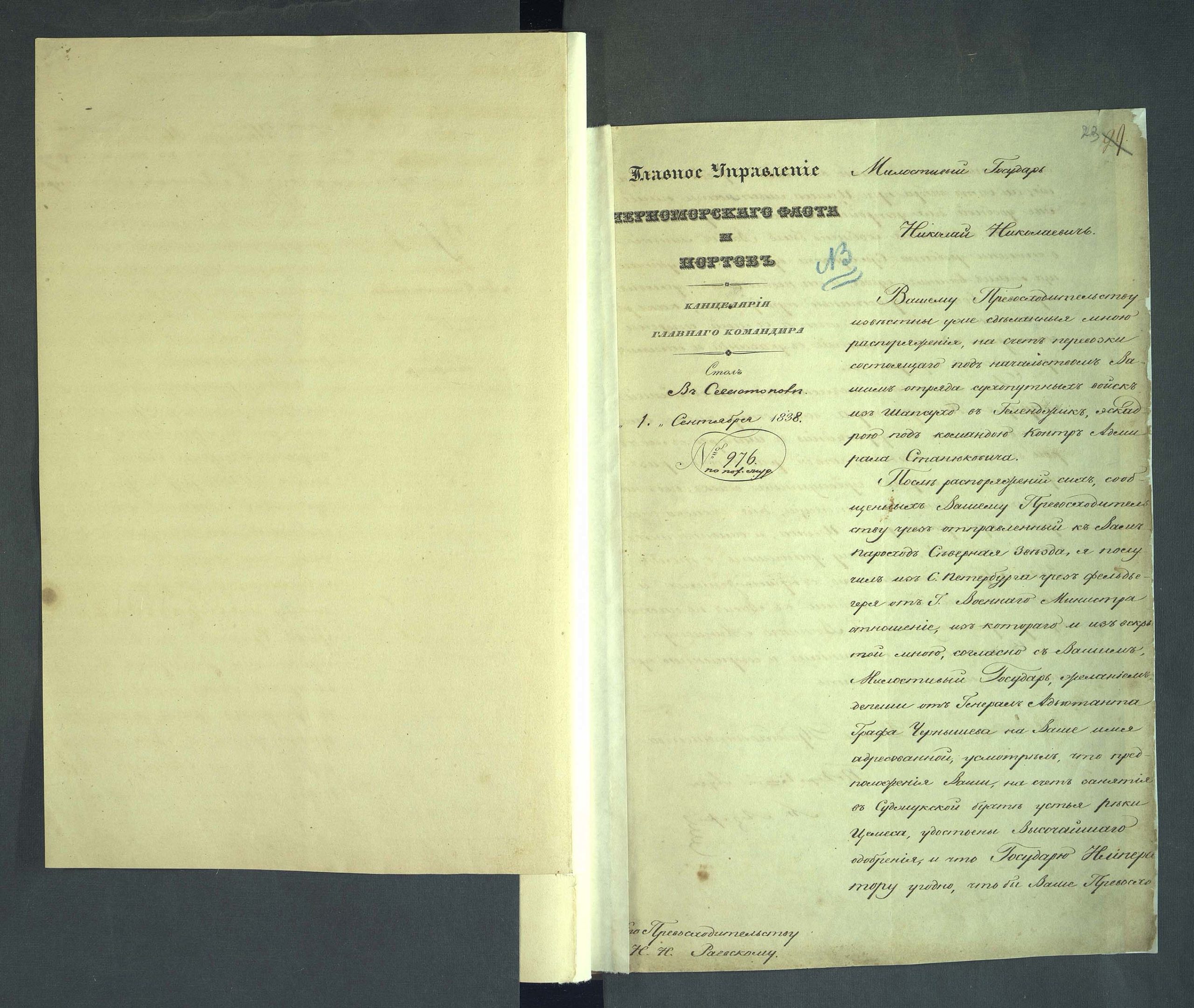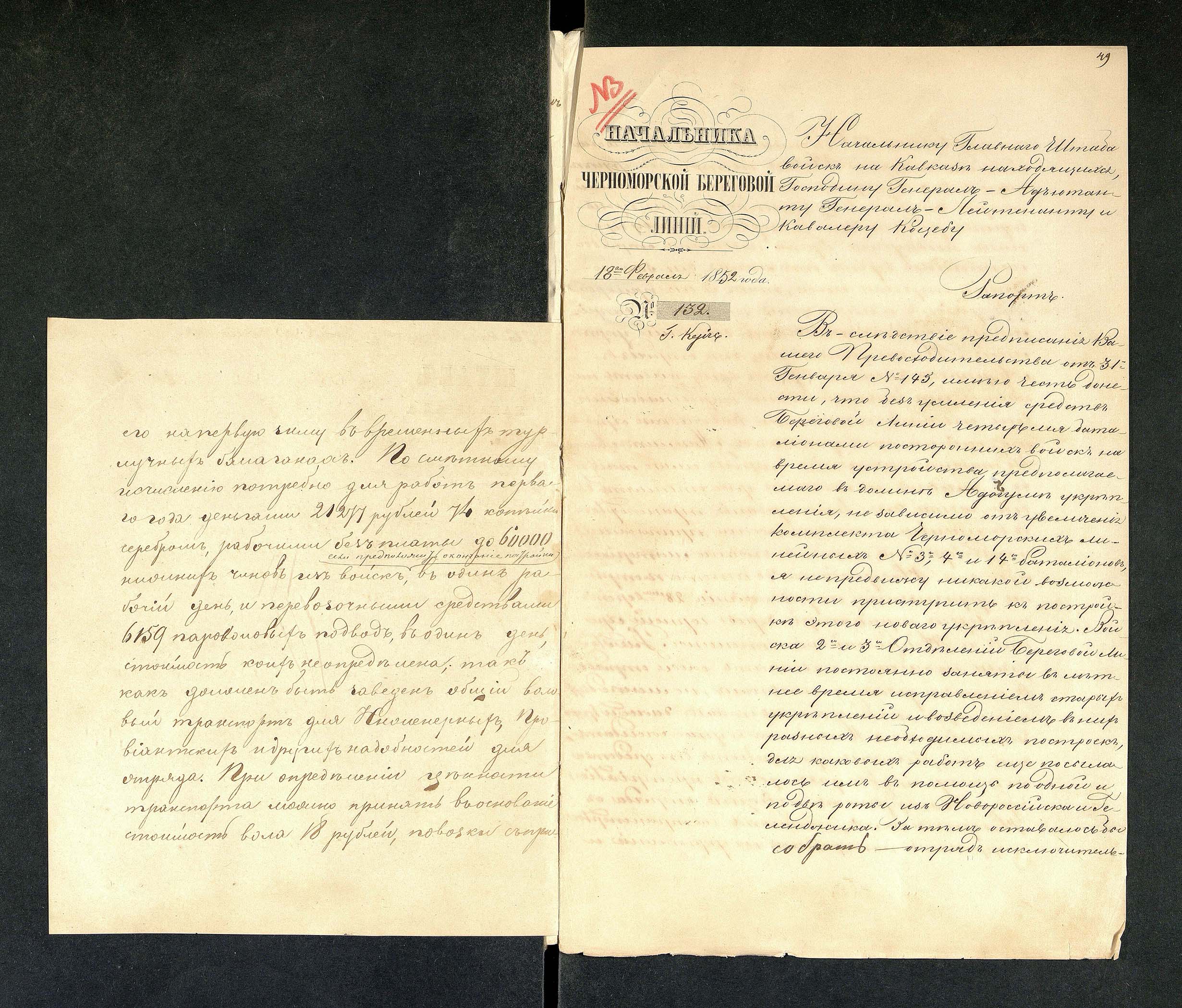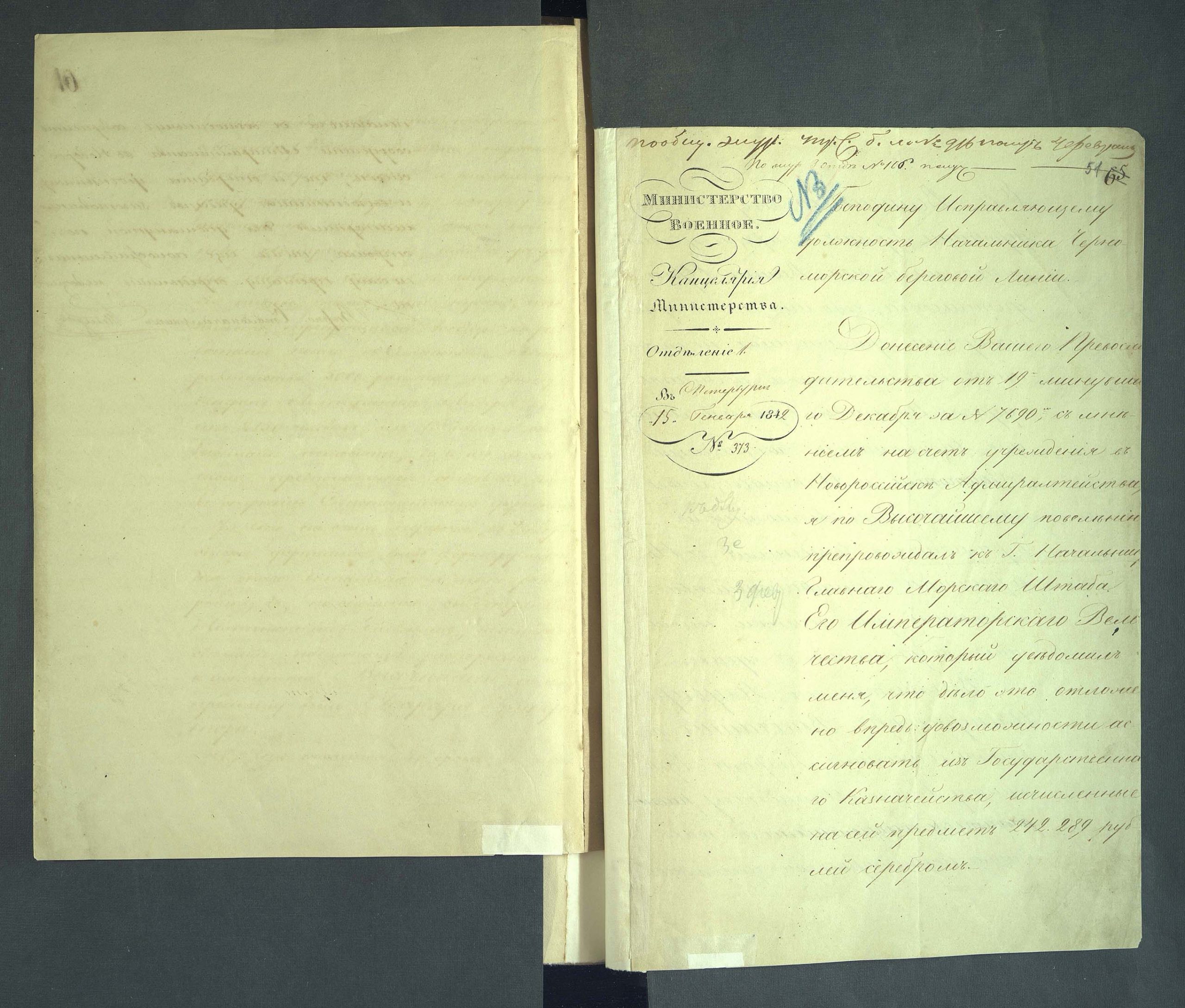 Документы ГКУ КК «Государственный архив Краснодарского края», фонда № 260 «Канцелярии начальника Черноморской береговой линии», опись № 1, оцифрованное дело № 17 «О занятии устья реки Цемеса в Суджукской бухте под устройство там Адмиралтейства и пристани», за 1838-1844 гг. — Письмо